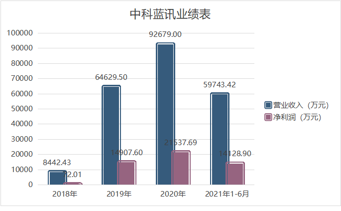 对应的业绩中,中科蓝讯 2018-2020 年营业收入有 8442.43 万元、6.46 亿元、9.27 亿元,对应净利润 72.01 万元、1.49 亿元、2.15 亿元。
