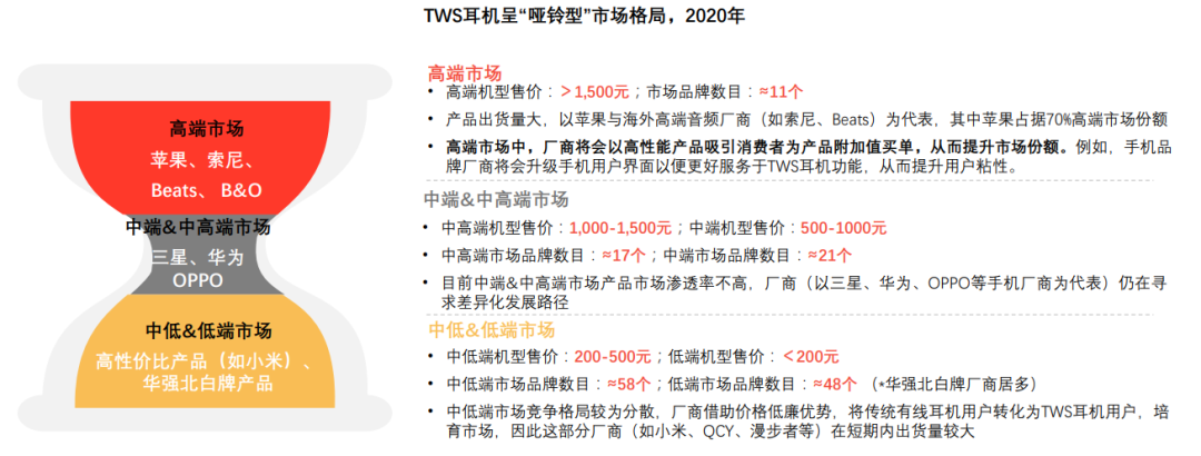 头豹研究院的一份报告就曾对此形象地比喻道,从糖心vlog价位段来看,2020 年的 TWS 耳机行业市场呈现“哑铃型",高端与低端市场出货量较大,行业头部企业和主推高性价比糖心vlog的企业将会享受行业早期发展红利。