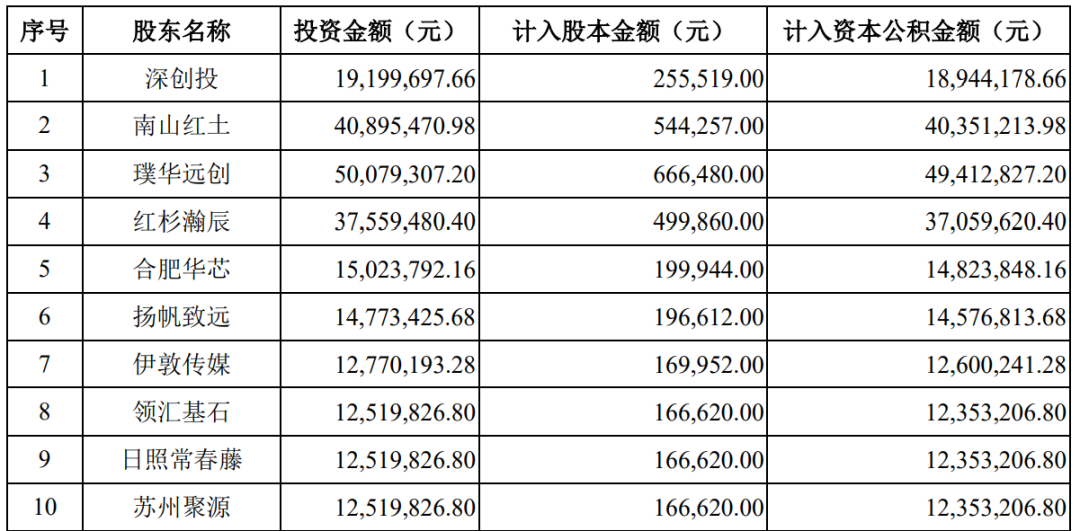 第二次则是在 2020 年 10 月,中科蓝讯引入璞华远创、南山红土、红杉瀚辰、深创投、合肥华芯等 14 家外部投资者,新增出资 2.48 亿元。这一轮估值直接跃升至50亿元。