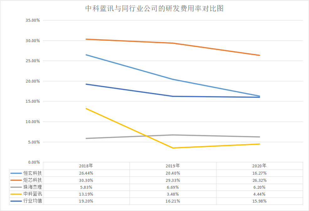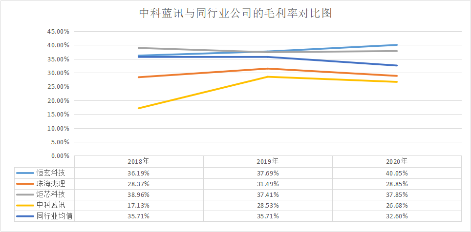 如上图显示,2018年至2020年,中科蓝讯的毛利率分别为 26.68%、28.53%和 17.13%,远低于近三年的行业均值 35.71%、35.71、32.60%。如果单一对比行业内服务于品牌客户(小米、华为、OPPO 等)的恒玄科技时,这一差距变得尤为明显,在 2020 年相差了 13.37%。