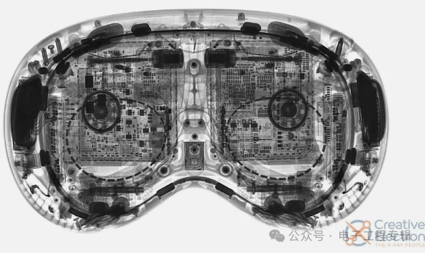 iFixit还找到Creative Electron给Vision Pro拍了一个X光透视图,据说这张X光照片的成本是3500美元(约等于一台全新Vision Pro)。在X光片中,我们能看到各类摄像头、传感器、部分芯片以及电路板上密密麻麻的电子元器件。