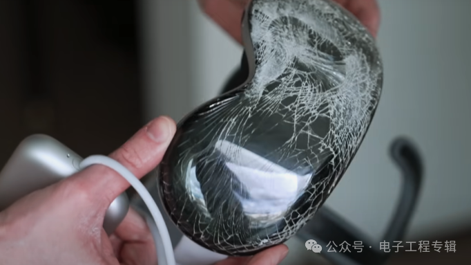 基于此,AppleTrack 也做了一项耐用性测试,其发现在正常磨损情况下,例如戴着耳机在房子里走来走去时撞到墙壁或柜子,Vision Pro 前玻璃会被磨损,但不会造成严重损坏。倘若从头部高度掉落,Vision Pro 的前玻璃可能会完全粉碎,扬声器也大概率不能幸免。下图就是 AppleTrack 摔了八次后的样子: