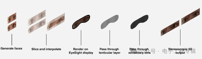 具体操作是通过内部摄像头和传感器生成人脸,然后VisionOS会将人脸“切片并插值”,接着渲染在EyeSight显示屏上,图像通过一层透镜再通过一层镜片,最终实现3D人脸图像的视觉效果。
