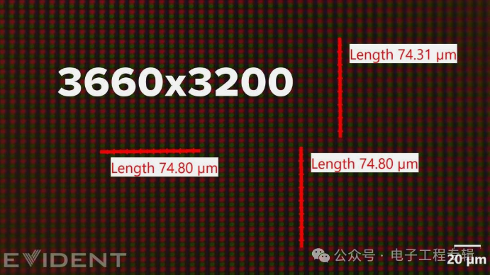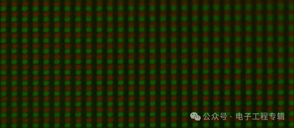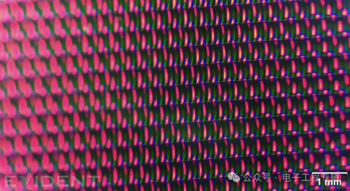 不过根据显微镜画面,蓝色子像素呈“长条状”,红绿子像素呈“圆点状”,三者形态并不相同。