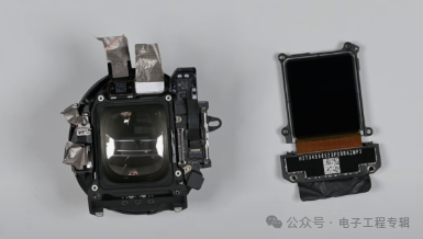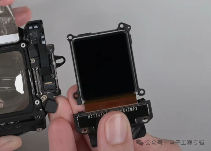 拆完外屏之后,iFixit拆下来的是光学和显示模组部分,包括MicroLED屏幕、镜片以及相关机械滑轨结构。