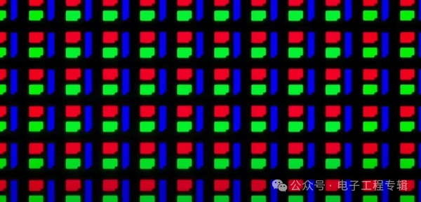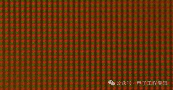 具体来看每颗像素的结构,红色和绿色子像素纵向上下放置在一起,而蓝色子像素‍的长度大约是红色和绿色子像素的两倍,位于红绿子像素的边上。