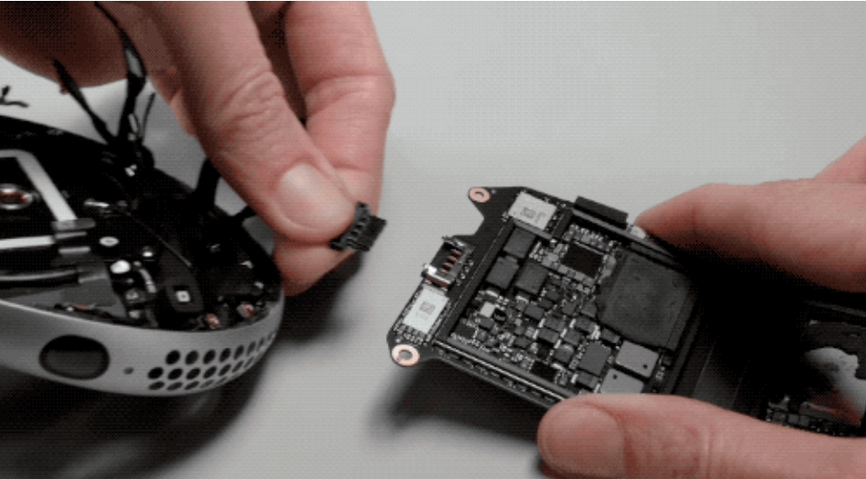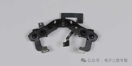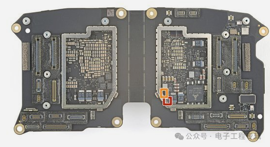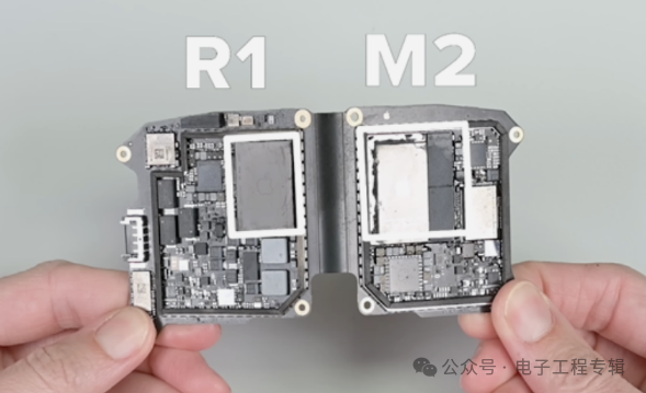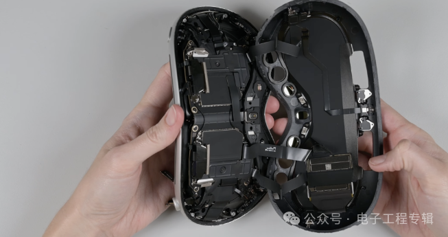 拆解视频显示,M2和R1两颗芯片分别位于左眼右眼两侧的主板上,两块主板都采用了柔性PCB设计,中间也通过柔性PCB相连。