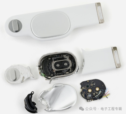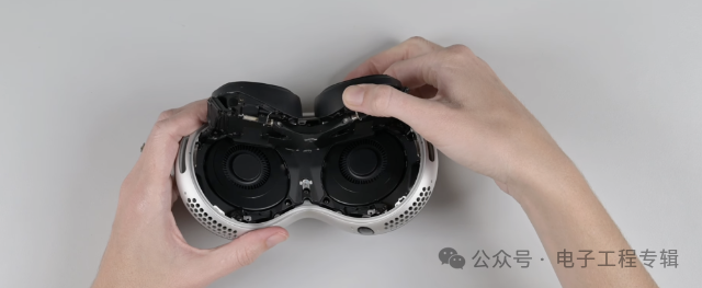 iFixit还“暴力”破拆了扬声器,扬声器固定在与机身主体两侧的头带上,只需使用SIM卡针即可取出,iFixit表示可穿戴设备非常容易损坏,因此拥有易于更换的扬声器模块很有意义。
