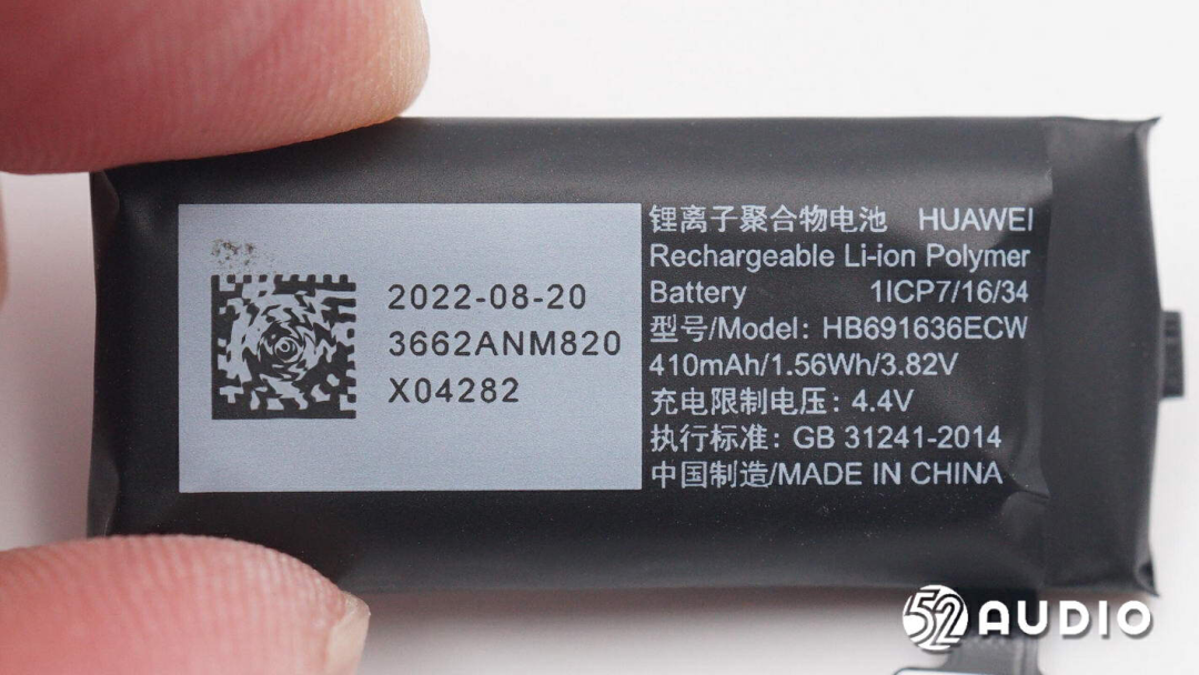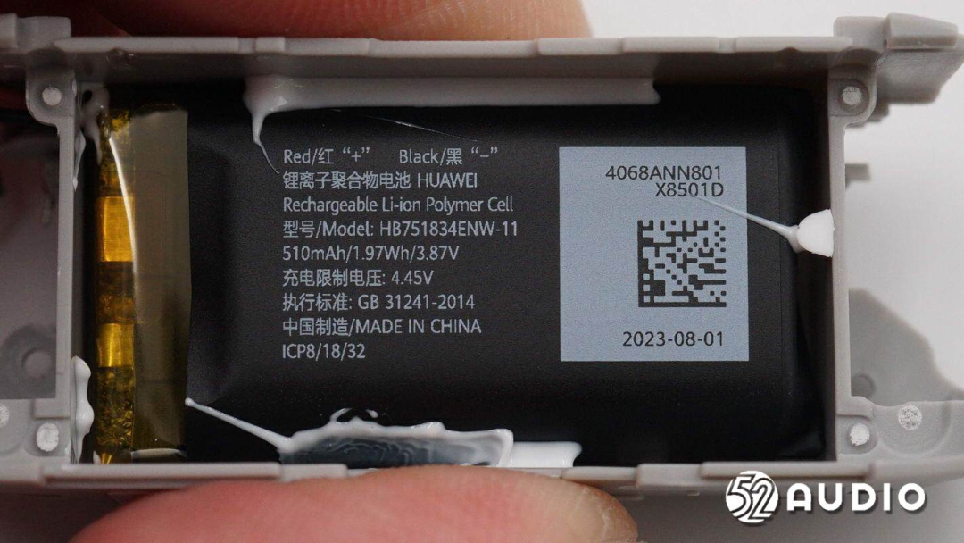华为FreeBuds 5充电盒内置锂离子聚合物电池组,额定容量:505mAh 1.95Wh,标称电压:3.87V,充电限制电压:4.45V,内部电芯型号为731832,来自ATL东莞新能源。