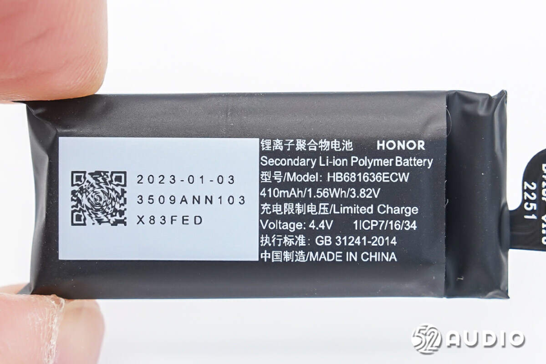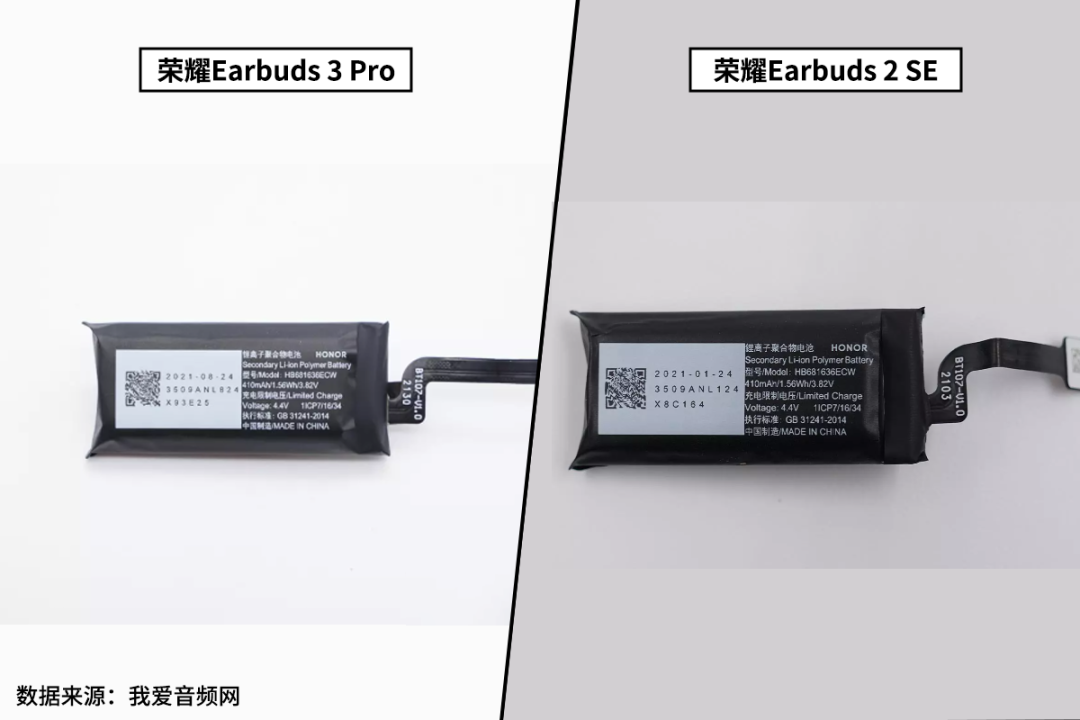 荣耀Earbuds 3 Pro和荣耀Earbuds 2 SE充电盒内部采用了相同规格的锂电池,电池型号:HB681636ECW,容量:410mAh/1.56Wh,电压:3.82V,充电限制电压:4.4V,来自ATL新能源科技。