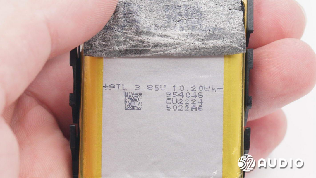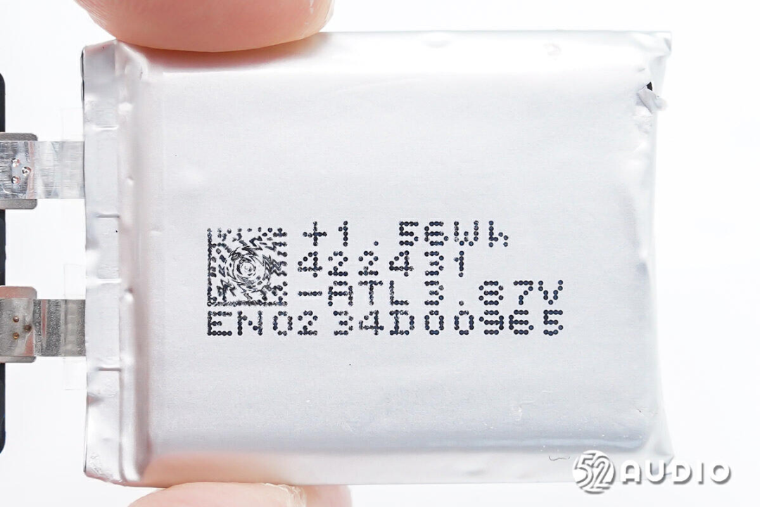 经过拆解发现,耳机充电盒内置锂离子聚合物电池,型号:HB681636ECW,额定容量:410mAh/1.56Wh,标称电压:3.82V,充电限制电压:4.4V,电芯部分来自ATL东莞新能源。